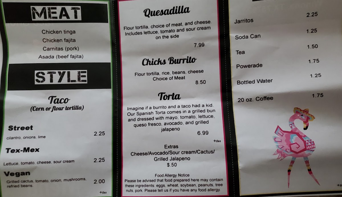 Welcome to Pink Flamingos, a vibrant culinary gem nestled in Winona, Texas. This lively eatery specializes in customizable tacos, allowing patrons to choose from a mouthwatering array of meats, including Carne Asada, Al Pastor, and Shredded Chicken. For those seeking a meatless option, the Veggie Style Taco is a delightful choice at just $3.99.